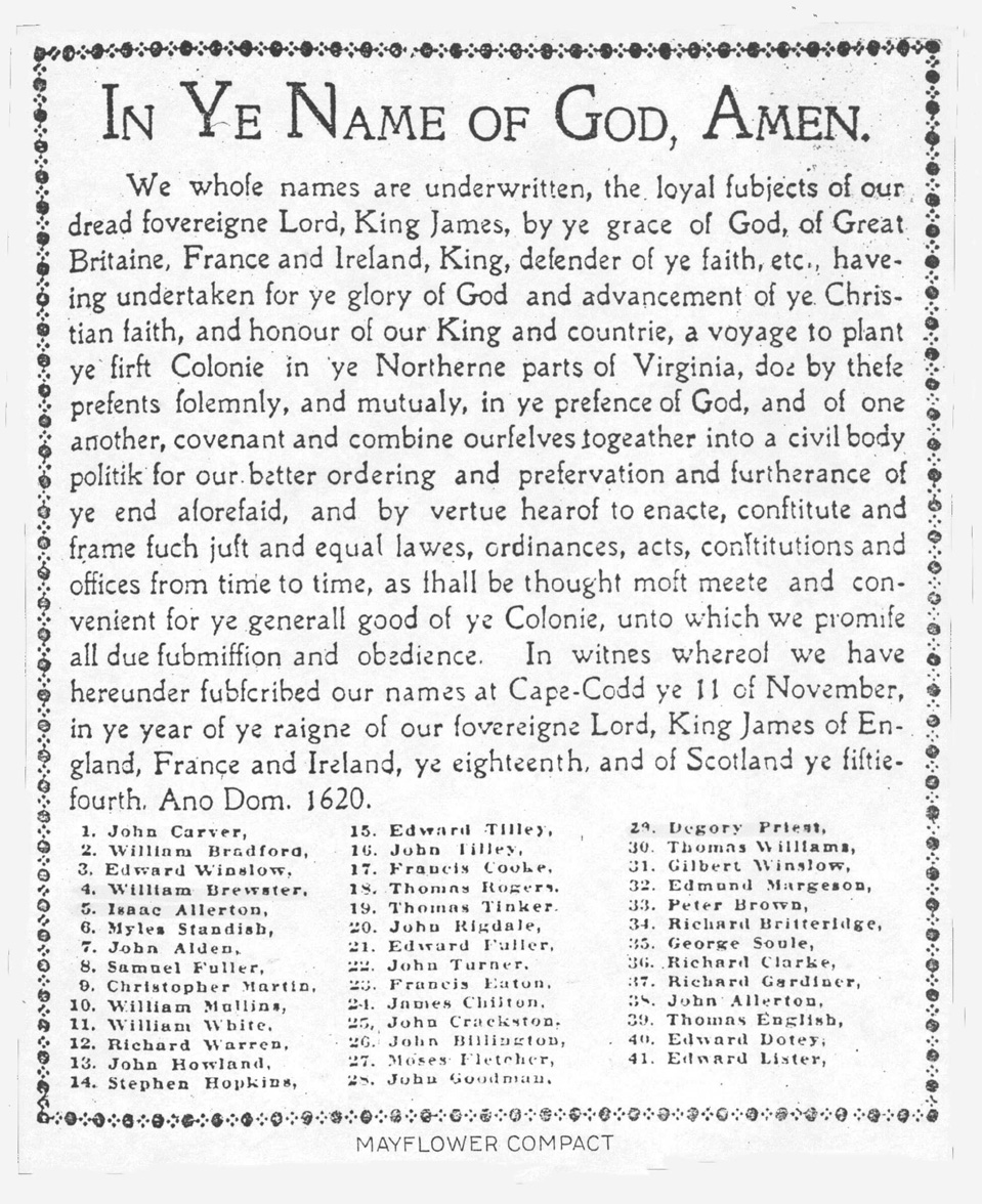 The Mayflower Compact was the first governing document of Plymouth Colony. It was written by the Separatists, also known as the "Saints", fleeing religious persecution from James VI and I.